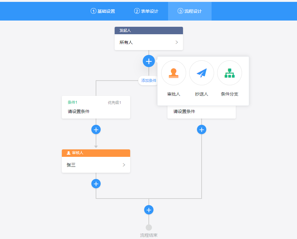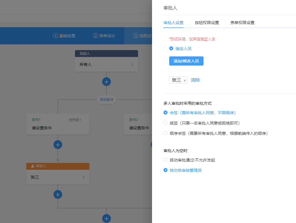 1、节点设置(包括审批人、发起人、抄送人、条件设置)